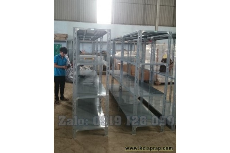 Đây là mẫu kệ kho chứa hàng, lưu trữ hồ sơ tài liệu. Lắp ráp bằng Thép V lỗ đa năng và mâm tôn sơn tĩnh điện màu xám ghi.