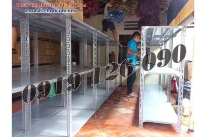 Đây là mẫu kệ kho chứa hàng, lưu trữ hồ sơ tài liệu. Lắp ráp bằng Thép V lỗ đa năng và mâm tôn sơn tĩnh điện màu xám ghi.