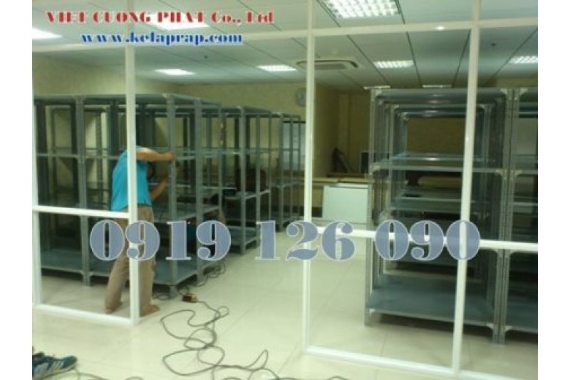 Đây là mẫu kệ kho chứa hàng, lưu trữ hồ sơ tài liệu. Lắp ráp bằng Thép V lỗ đa năng và mâm tôn sơn tĩnh điện màu xám ghi.