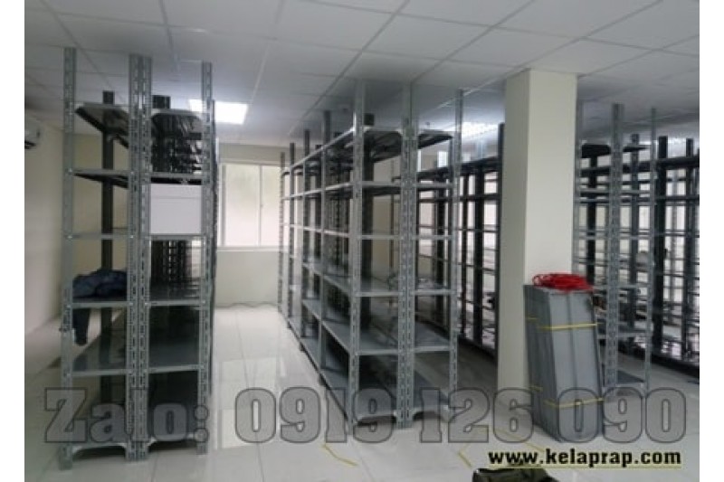 Đây là mẫu kệ kho chứa hàng, lưu trữ hồ sơ tài liệu. Lắp ráp bằng Thép V lỗ đa năng và mâm tôn sơn tĩnh điện màu xám ghi.