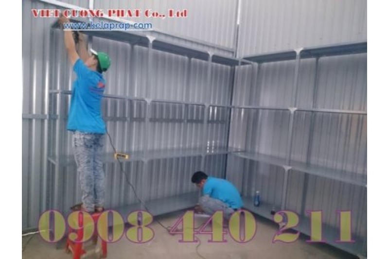 Đây là mẫu kệ kho chứa hàng, lưu trữ hồ sơ tài liệu. Lắp ráp bằng Thép V lỗ đa năng và mâm tôn sơn tĩnh điện màu xám ghi.