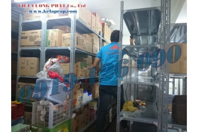 Đây là mẫu kệ kho chứa hàng, lưu trữ hồ sơ tài liệu. Lắp ráp bằng Thép V lỗ đa năng và mâm tôn sơn tĩnh điện màu xám ghi.